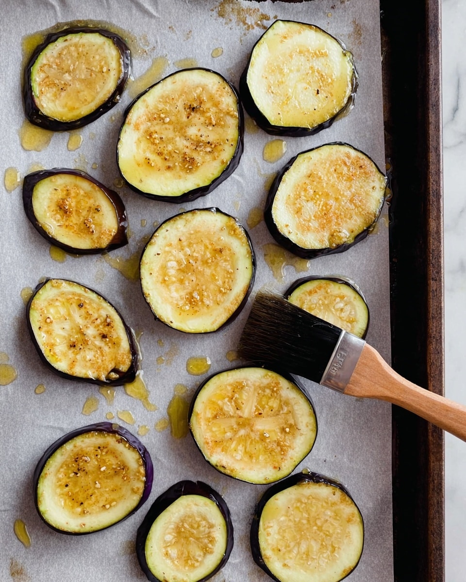- I start by preheating the oven to 200°C (400°F). I slice the eggplant into rounds, brush both sides lightly with olive oil, season with salt and pepper, and roast for about 20 minutes until golden and soft.