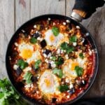 A hearty and flavorful shakshuka featuring smoky roasted eggplant, spiced tomato sauce, and soft-poached eggs, perfect for brunch or a cozy vegetarian dinner.