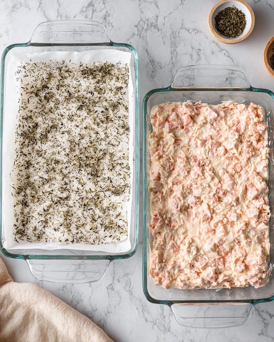 - Spread the salmon mixture evenly over the rice layer.