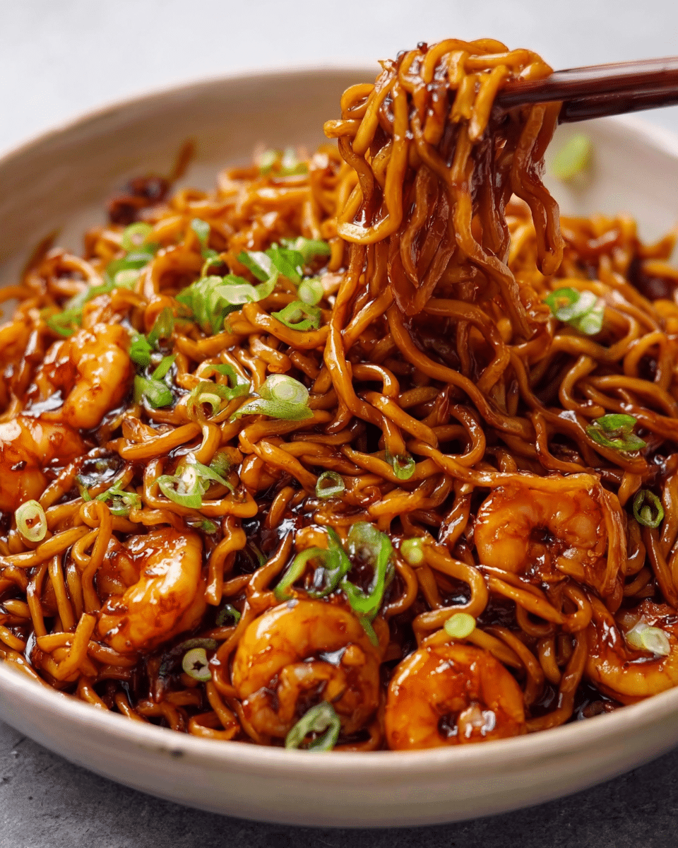 - I add the cooked noodles to the skillet, tossing everything together until the noodles are coated in the sticky garlic sauce.