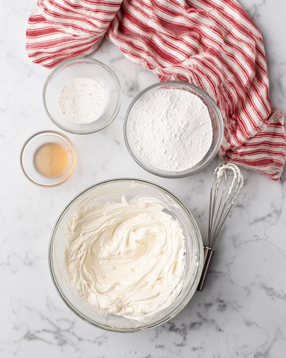 - While the cake is cooling, prepare the marshmallow buttercream: In a large bowl (or stand mixer), beat the room-temperature unsalted butter until creamy and light in color (about 2-3 minutes). Gradually add the confectioners’ sugar, vanilla extract, heavy cream, and kosher salt. Beat until smooth and slightly fluffy. Then beat in the marshmallow creme (both containers) until the frosting is smooth, fluffy, and well-incorporated. (Recipes show that this style of marshmallow buttercream results in a light, cloud-like frosting. (Our Best Bites))