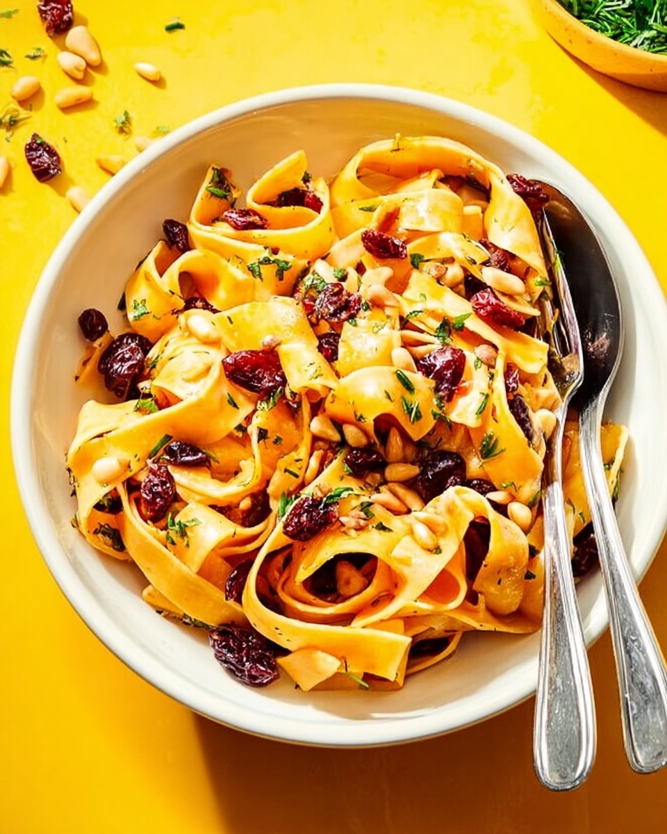 A rich and elegant dish featuring spiralized sweet potato noodles coated in a creamy gorgonzola sauce, topped with toasted pine nuts and dried cranberries for the perfect balance of sweetness, tang, and crunch.