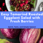 A vibrant and tangy Tamarind Roasted Baby Eggplant Salad combining tender roasted baby eggplants with fresh raspberries, crisp red oak lettuce, and crunchy pepitas, all tossed in a flavorful tamarind dressing that balances sweet, savory, and tart notes perfectly.
