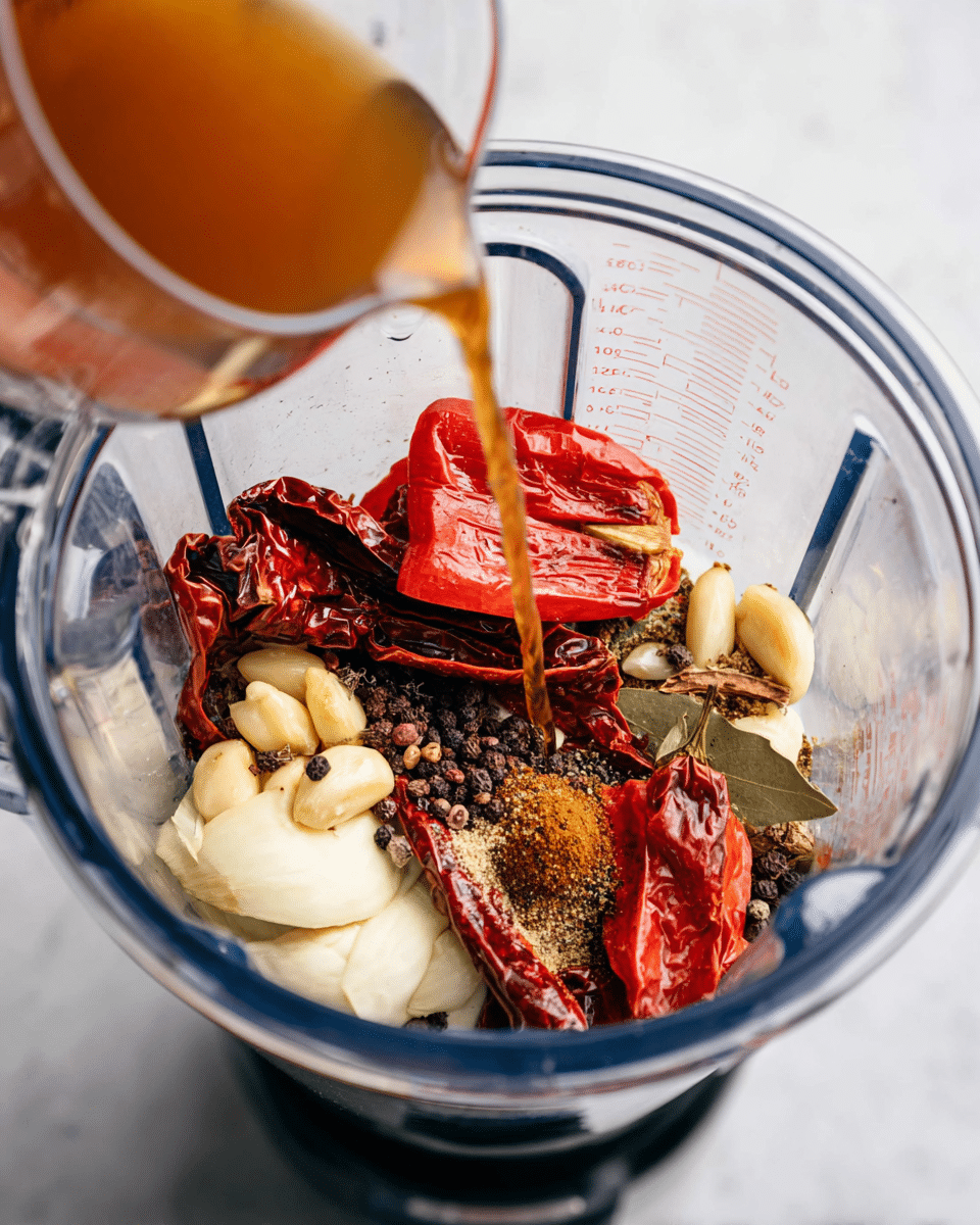 - Once the chiles are softened, I drain them and remove the garlic skins. Then I add the chiles, roasted vegetables, beef broth, vinegar, salt, pepper, cumin, oregano, cloves, cinnamon, and ginger to a blender. I blend until the sauce is completely smooth.