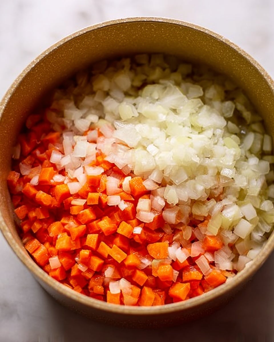 - I add the diced onion, minced garlic, and carrots, cooking for about 5–7 minutes until the vegetables are soft and fragrant.