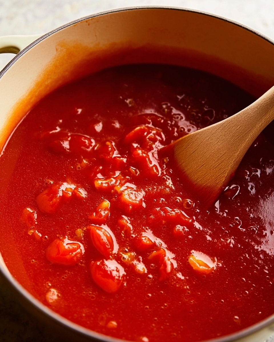 - Next, I pour in the canned tomatoes (with their juices), broth, and water. I stir well and bring the mixture to a gentle boil.