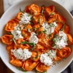 A rich and creamy tortellini dish coated in a smooth roasted red pepper sauce with hints of garlic, spice, and Parmesan, topped with burrata and fresh basil for an elegant, restaurant-quality meal made in 30 minutes.