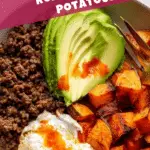 When ready to enjoy leftovers, reheat the sweet potatoes and ground beef in the microwave or on the stovetop until warm. Add fresh cottage cheese, avocado slices, and hot honey just before serving to keep the bowls vibrant and flavorful.