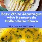 A simple and elegant recipe for tender white asparagus served with a smooth, herb-infused hollandaise sauce. This dish combines the delicate flavor of white asparagus with a rich, creamy sauce made from egg yolks, melted butter, lemon juice, and fresh herbs, perfect for a light appetizer or side dish.