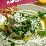 A close-up of a white bowl filled with creamy light green dip that has a thick, slightly chunky texture, topped with a drizzle of olive oil and sprinkled with chopped fresh dark green herbs. A woman's hand is dipping a triangular, lightly browned crisp chip into the dip, scooping up a small amount. The bowl is set on a white marbled surface with a lemon wedge blurred in the background. Photo taken with an iphone --ar 4:5 --v 7